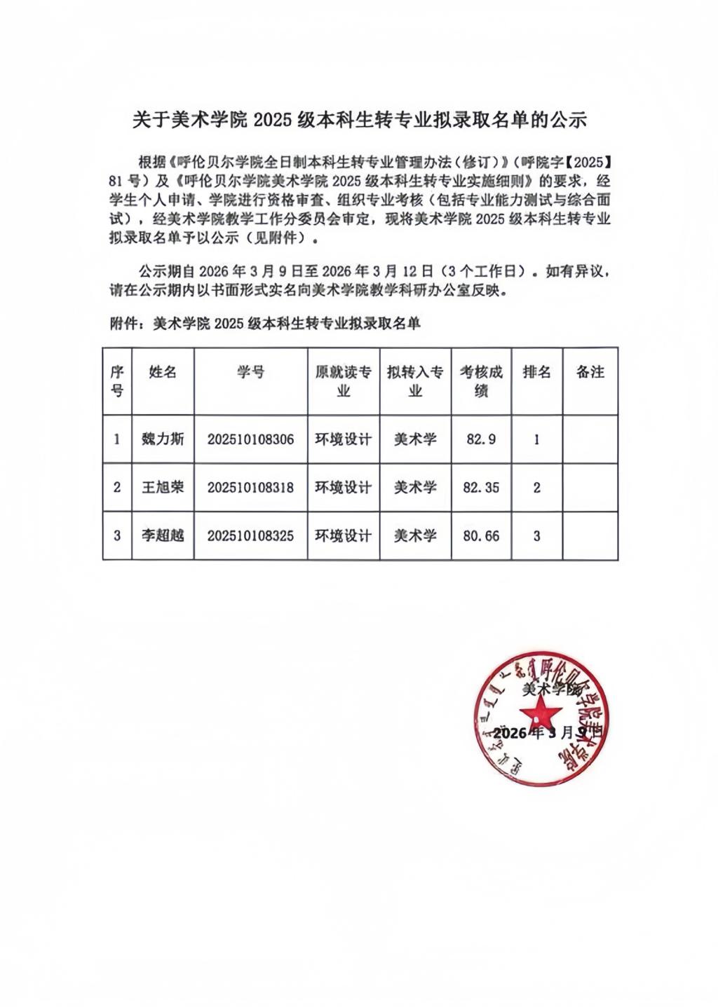 关于美术学院2025级本科生转专业拟录取名单公布